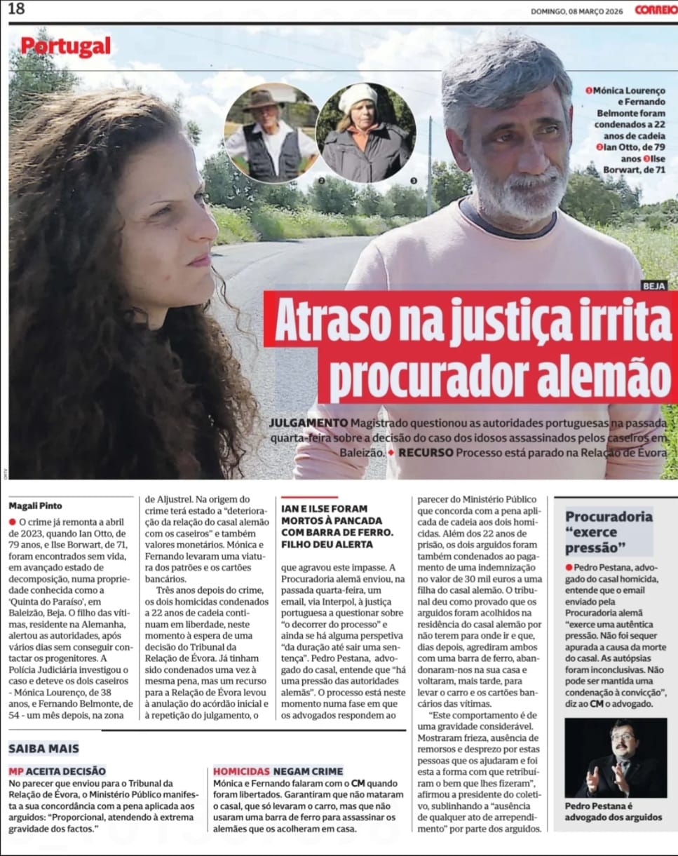 Atraso na Justiça irrita procurador alemão. Fernando e Mónica negam duplo homicídio em Baleizão.