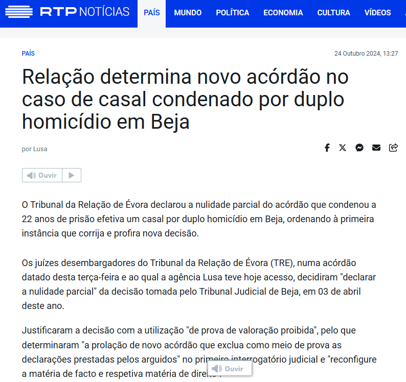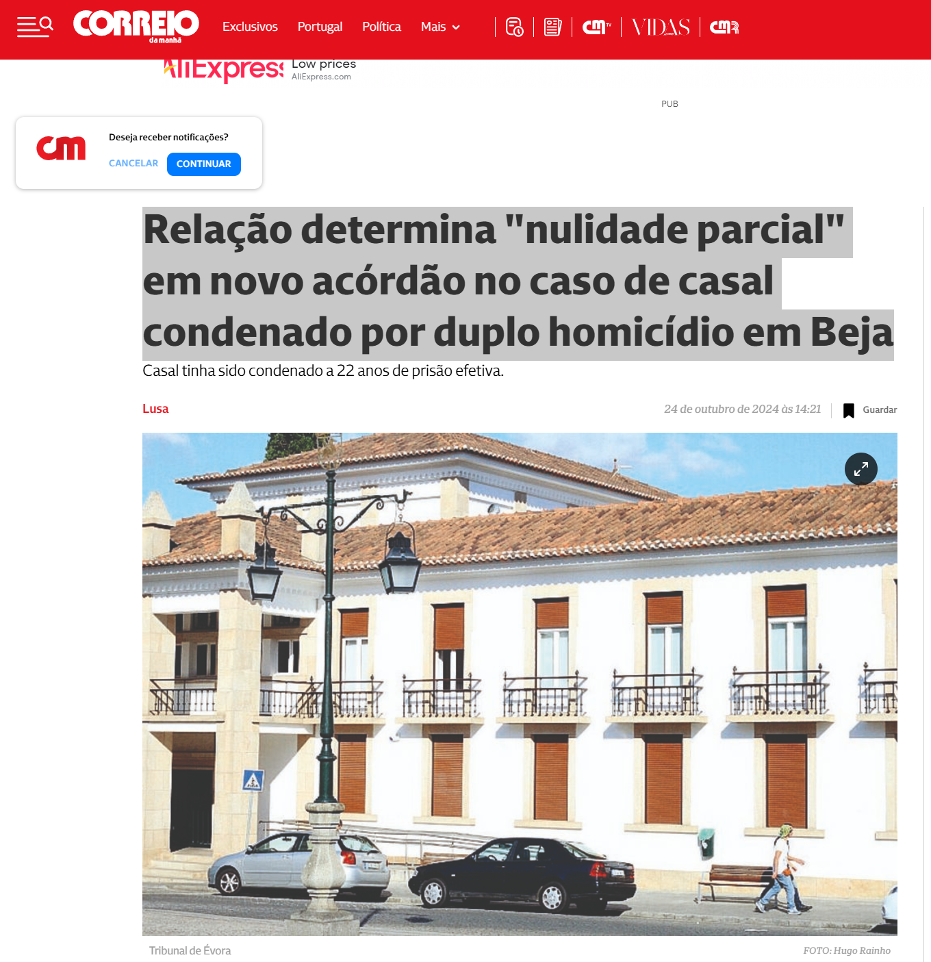 Relação determina "nulidade parcial" em novo acórdão no caso de casal condenado por duplo homicídio em Beja.