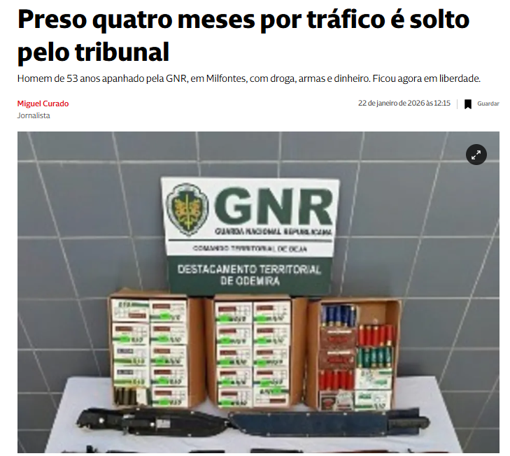 Um homem de 53 anos, que esteve cerca de quatro meses em prisão preventiva após ter sido detido pela GNR, em setembro de 2025, em Vila Nova de Milfontes, por ter sido apanhado a traficar drogas duras, foi libertado por um juiz de instrução criminal da comarca de Odemira. Na origem da decisão está o facto de o suspeito ter sido acusado pelo Ministério Público (MP) pelo crime de tráfico de menor gravidade, que não prevê prisão preventiva.